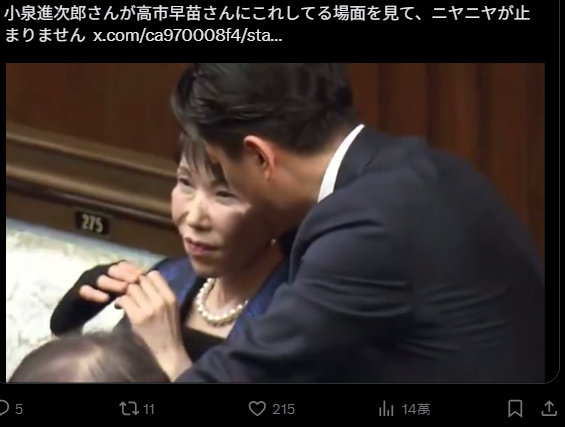 “看到小泉进次郎对高市早苗做这个动作的场面,我忍不住一直傻笑。”