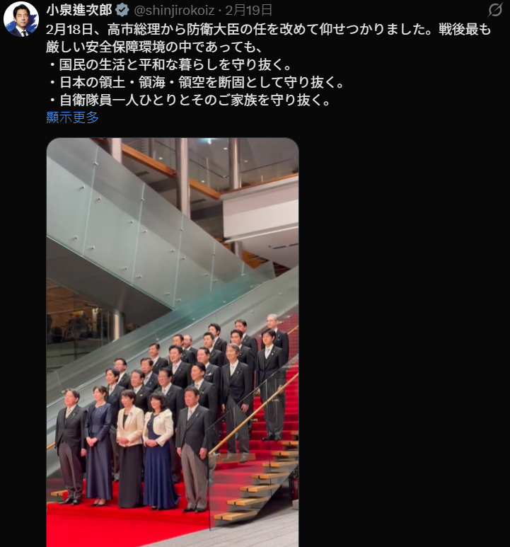 完成整理后,小泉朝拍摄镜头露出微笑。合影约1分钟结束,高市向阁僚道“晚安”后离场,小泉则鞠躬回应。