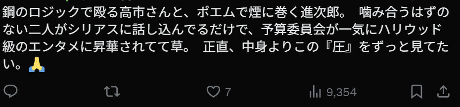 “用钢铁般逻辑狠狠干人的高市,和用诗一样的发言把人绕晕的进次郎。本来完全不可能合拍的两个人,只是认真地聊着天,就把预算委员会瞬间升华成好莱坞级别的娱乐节目,笑死。老实说,比起内容,我更想一直看这种‘气场压迫感’。”