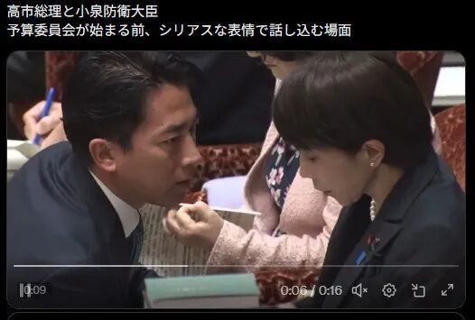 视频本身很正常,显示的就是小泉和高市似乎在商讨某件事,二人不停地点头表示认可,除此以外也就没别的了。