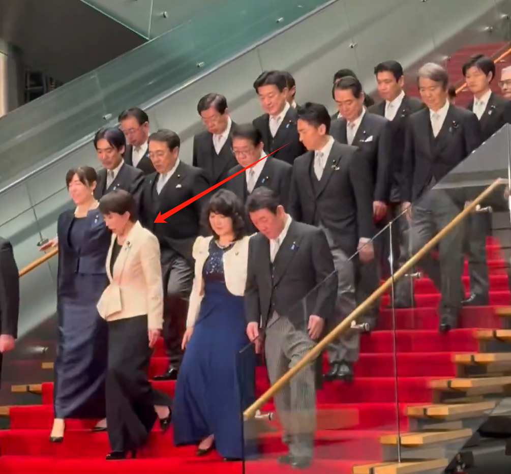 画面显示,高市与阁僚在铺有红地毯的阶梯上列队拍照。高市走下阶梯时,黑色礼服下摆一度挂在上一级台阶。