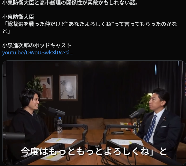 诡异的cp粉诞生后,小泉还时不时撒糖。去年11月,小泉在接受采访时表示虽然高市选举上了首相之位,但因为她对我说了句今后也拜托你了,所以我也会好好努力的。